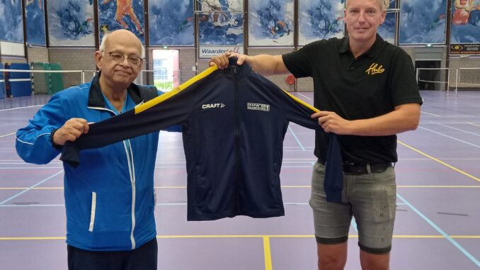 Boshoven (onze nieuwe voorzitter) heeft het eerste jasje namens onze vereniging in ontvangst
